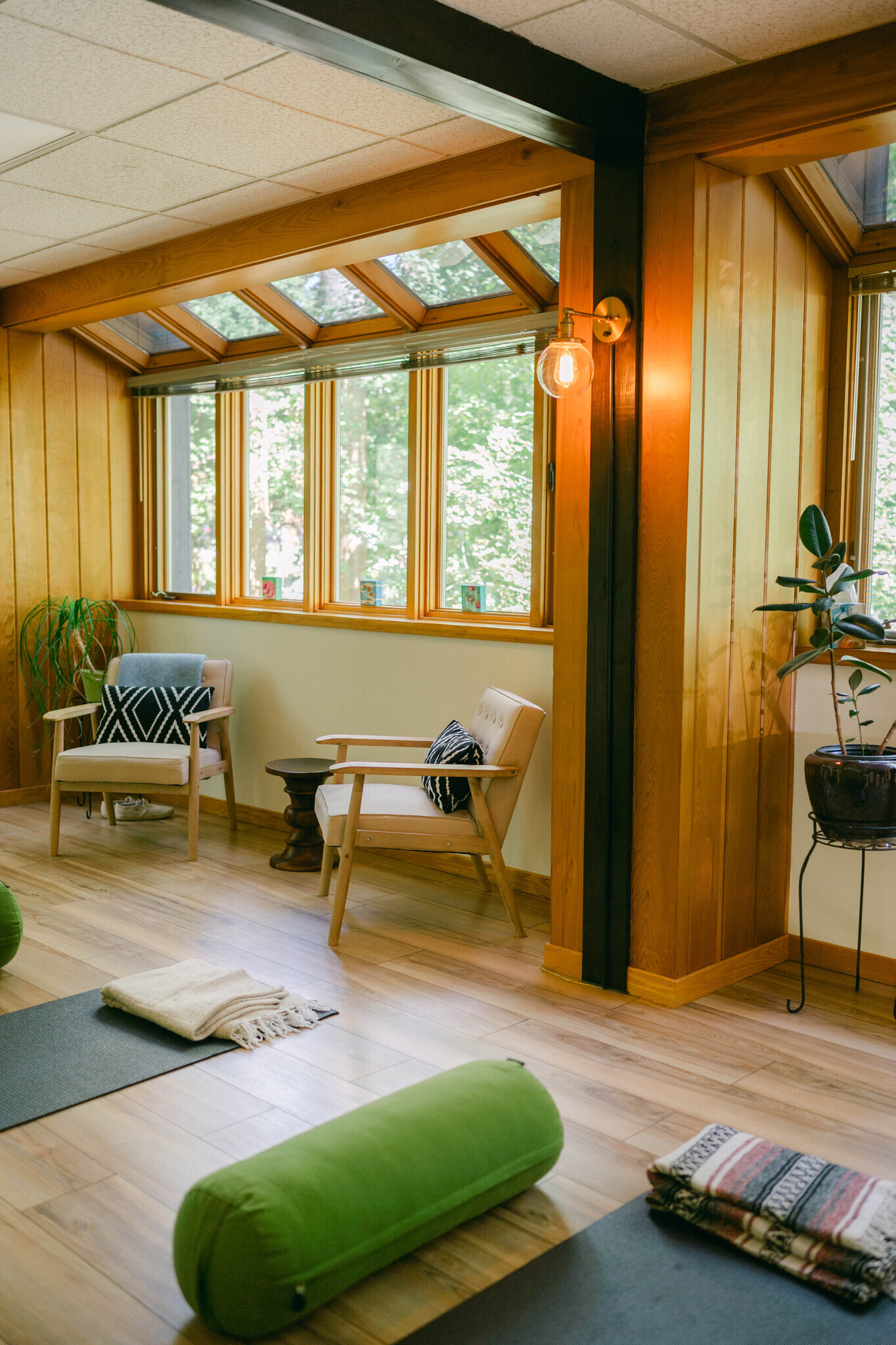 Spacious Grand Rapids studio tucked in between lushes trees, making the space feel cozy, warm, inviting. A rental space that easily transforms for wellness workshops, community circles, or intimate celebrations.